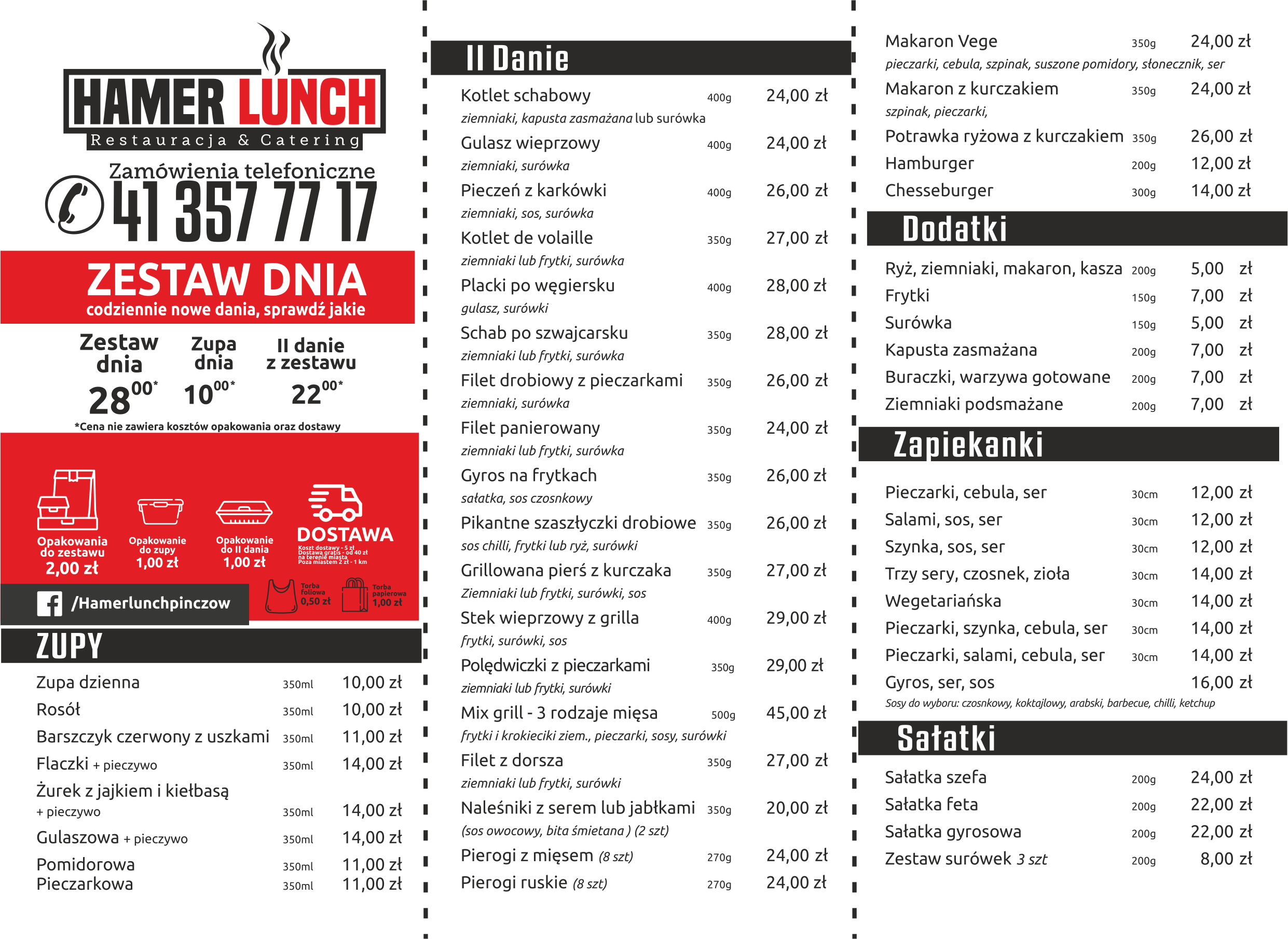22 maja 202516 listopada 2018 przez admin Witamy Państwa w restauracji Hamer Lunch, położonej w samym centrum Pińczowa. Oferujemy pyszne i tanie dania oraz obiady domowe.Restauracja powstała 2009 i działa nieprzerwanie do dziś. Nasze potrawy zawsze przygotowywane są ze świeżych oraz dobrych jakościowo produktów. Z całym zespołem zapewniamy, że w restauracji Hamer Lunch będziecie czuli się swobodnie, domowo, a to co serwujemy będzie smaczne. Zadzwoń i zapytaj o dzisiejsze danie dnia : ☎ 41 357 77 17 Przyjdź do nas lub zamów z dowozem Nasza aktualna ulotka